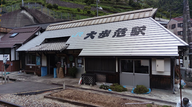 大步危峽是吉野川中游的一段峽谷,有分為大步危跟小步危兩部分,峽谷兩岸皆為峭立的岩石,在此段行走十分危險,因而有「步危」之稱,另外在過去日本語中「ほけ」指的就是溪谷邊的斷崖或是有很多奇岩怪石的地方,搭乘遊船欣賞峽谷景色已成了四國的重要觀光特色之一。大步危與小步危都有車站,一般都是搭到大步危站,大步危站旁緊臨吉野川的溪谷,車站旁有個觀景台可以腑看峽谷景色,月台上則是有個本地另一名景--祖谷蔓橋的縮小模型,那是幾天後我們才要去的地方。