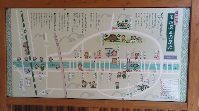 玉造溫泉的歷史悠久,從八世紀的奈良時代就有記述,而因附近有玉石產地,因此得名玉造,到處都可見到勾玉的圖案,溫泉區主要沿著玉湯川分布,整治過的河岸還有足湯可泡,有新北投的感覺。玉造溫泉有美肌之湯之稱,泉質是硫酸鹽-鹽化物泉,有化妝品公司做過分析發現成份與化妝水的保溼效果相當,因此還真的有推出「玉造溫泉水」的產品呢,不過我們回旅館泡了溫泉後好像感覺沒什麼差別,大概要天天泡才會看出效果吧。